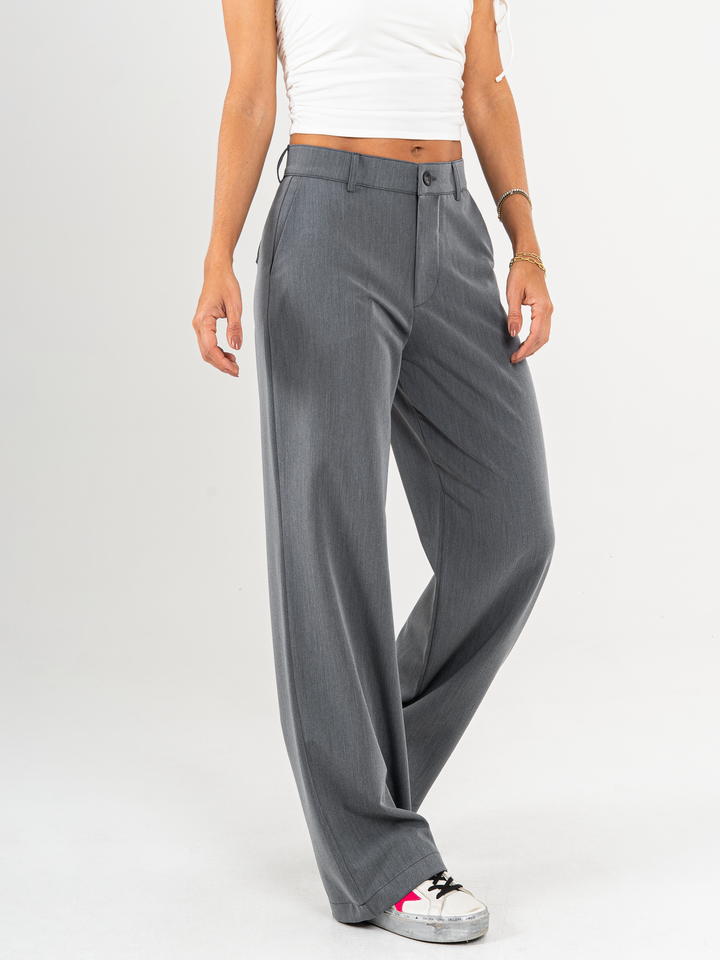 Pantalón straight leg, stretch, tono gris, tiro alto, tejido plano liviano, bolsillo tapas, silueta amplia.