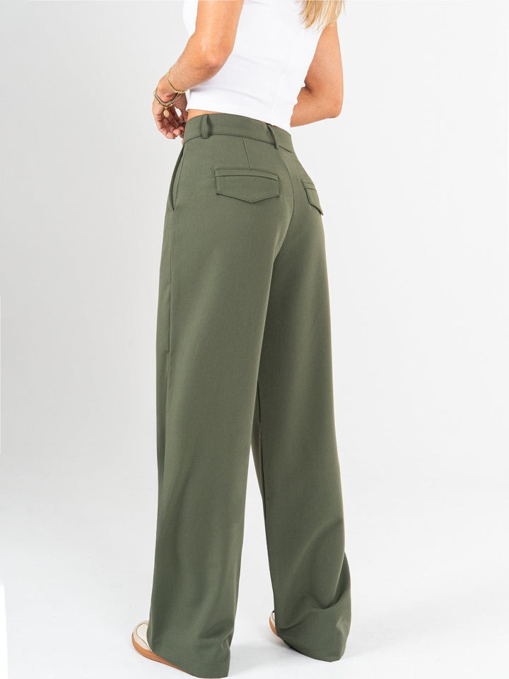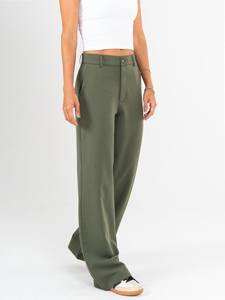 Pantalón straight leg, stretch, tono verde, tiro alto, tejido plano liviano, bolsillo tapas, silueta amplia.