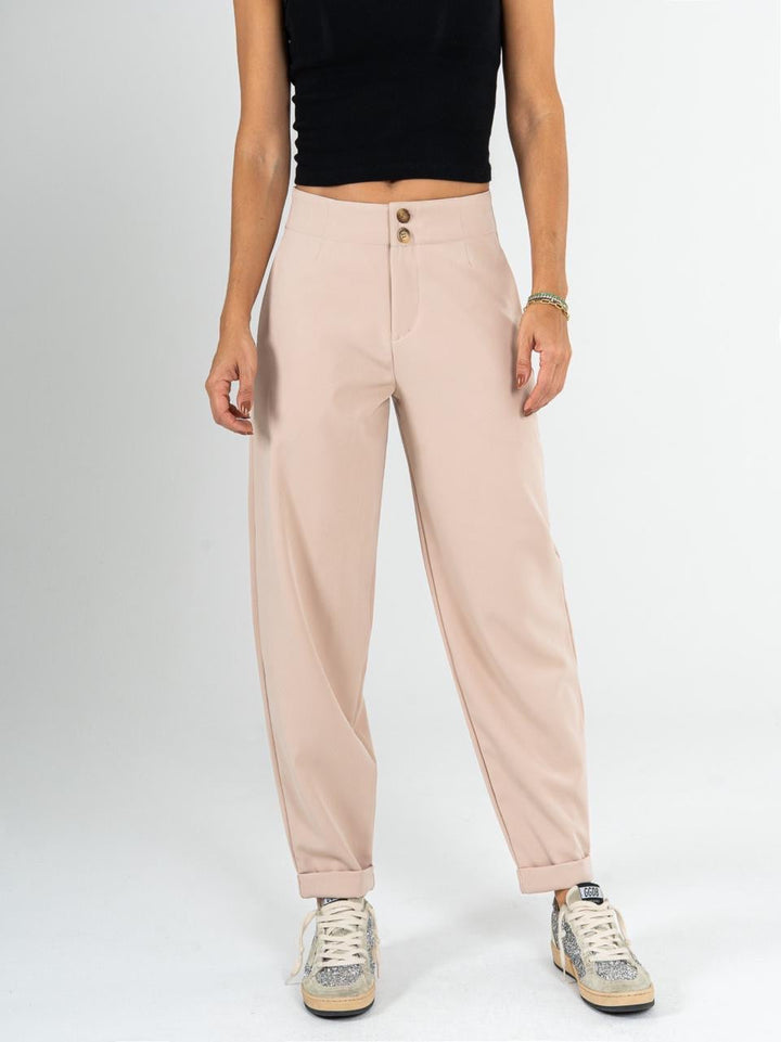 Ref: 069998 Pantalón slouchy, sin prense, tejido plano liviano, stretch, tiro alto, detalle en pretina, tono arena.