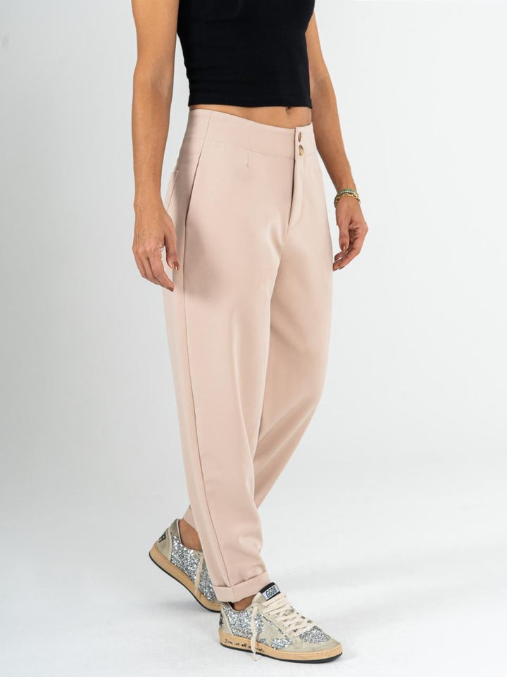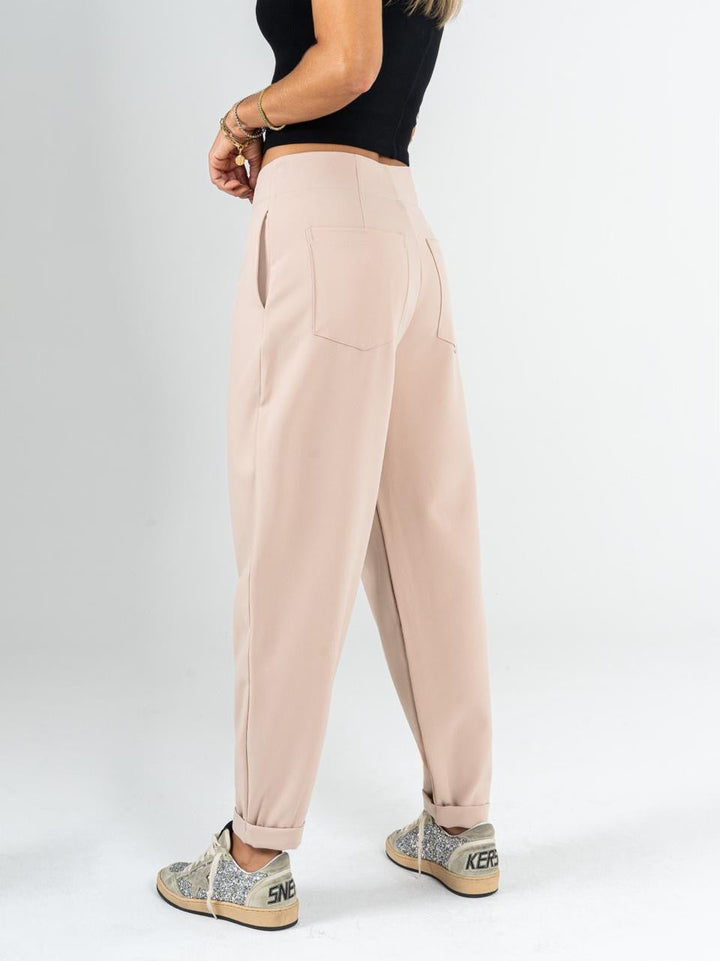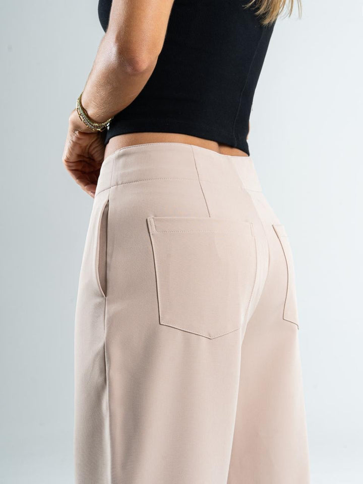 Pantalón slouchy, sin prense, tono arena, tejido plano liviano, tiro alto, bolsillo, detalle en pretinasilueta amplia.